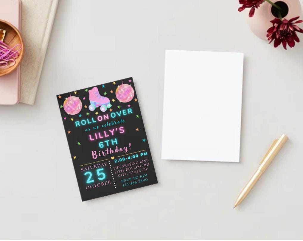 Get ready to roll into fun! This bright and colorful Roller Skating Birthday Invitation is the perfect way to kick off your child’s party in style. Featuring glowing neon colors, disco balls, and retro skates, this design is made to impress!